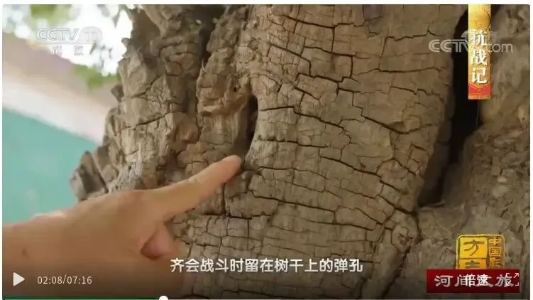 这是齐会村一棵600年古树上的弹孔,至今,这棵古树每年夏天枝繁叶茂,树盖如伞,象征着这个不屈的民族,历经苦难而不倒,负重前行,终至今天的繁荣昌盛。