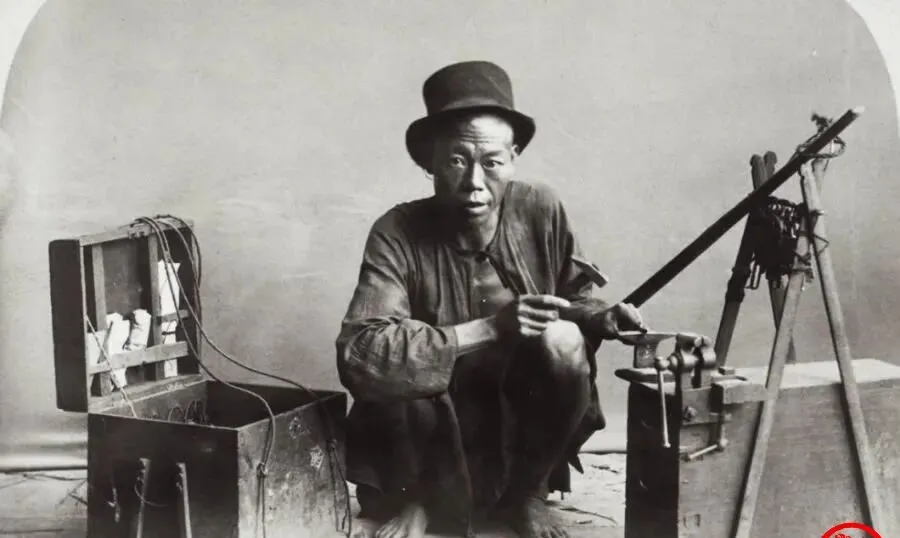 这个男人蹲守在一只开口铁箱旁\u2009,\u2002图中小铁箱像个移动工具库\u2009,\u2002里面塞着线圈铜片小锉刀\u2009,\u2002边上摆着一把台钳和细锯,手里捏的是金属条\u2009,\u2002看着像是配钥匙或修锁的行当,动作一紧一松\u2009,\u2002锉刀带着“吱啦”的细响,小时候外婆丢了抽屉钥匙\u2009,\u2002就找这种师傅来现场“学口”\u2009,\u2002几下子一配就灵。