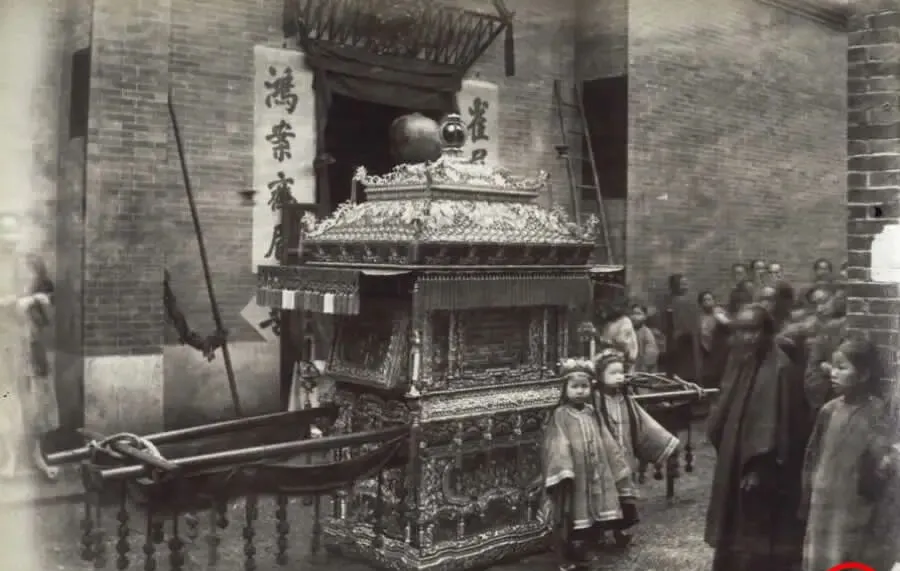 大花轿两侧各有一盏轿灯,铜托盘细长\u2009,\u2002蜡泪顺着滴到穗子上,等到傍晚起轿\u2009,\u2002灯一亮\u2009,\u2002街口的红影子就拉长了,表弟看见这张图问\u2009,\u2002“这不就是移动的摄影棚吗”,我笑着回他\u2009,\u2002那会儿拍照得摆架子等快门\u2009,\u2002可婚事的热闹啊\u2009,\u2002哪一代都一样热。