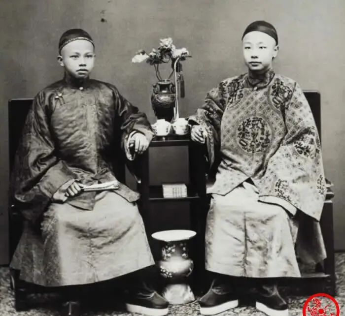 图中两位少年穿的是缎面长袍和高底鞋,袖口宽肥\u2009,\u2002衣料泛着细腻的亮\u2009,\u2002坐姿端着一股子气,桌上小花插在琉璃瓶里\u2009,\u2002茶盏几只排得整齐,外婆看了乐呵\u2009,\u2002说“这就叫气宇轩昂”,那会儿读私塾的多是人家子弟\u2009,\u2002写帖握笔讲究架势,现在娃儿上学背个书包挤地铁\u2009,\u2002却也能在屏幕里看世界。