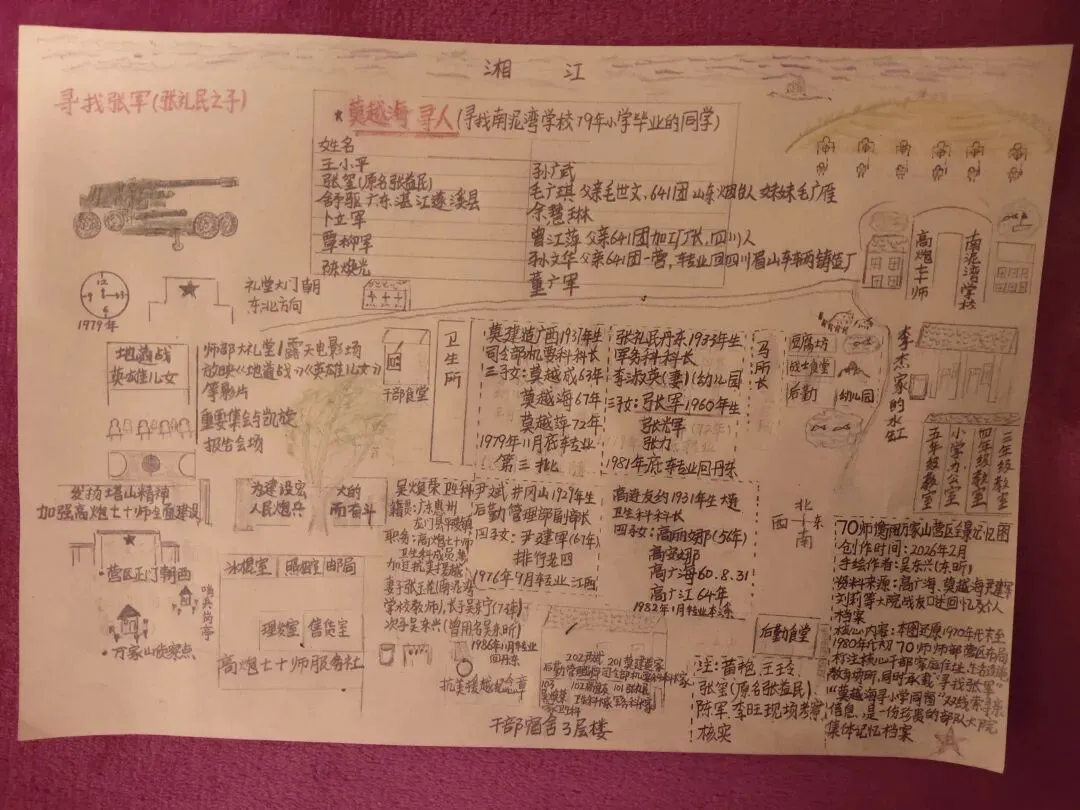 • 核心内容:本图还原1970年代末至1980年代初70师师部营区布局,标注核心干部家庭住址、生活设施及教育场所,同时承载“寻找张军”“莫越海寻小学同窗”双线索寻亲信息,是一份珍贵的部队大院集体记忆档案。