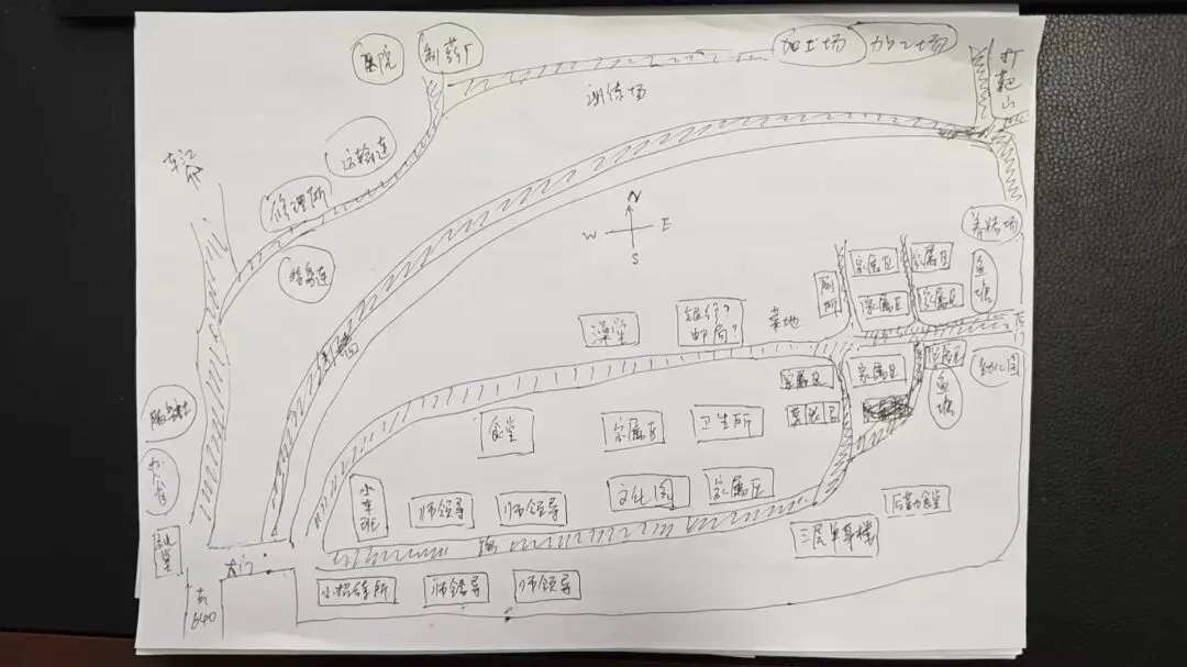 作品二:越海原创手绘师部营区图,与全景图互为补充。这张图从他个人的童年视角出发,补充了更多专业功能区的细节,如医院、制药厂、训练场、打靶山、运输连、修理所等,让整个师部营区的功能分区更加完整。图中的指北针(N/S/W/E)为营区方位提供了独立的参照系,可与全景图的“东北/正西”等描述相互校正,进一步提升了复原的准确性。