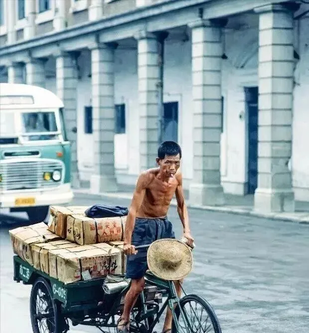 这辆人力三轮是真家伙,车厢里全是纸箱,车把前别着草帽,师傅光着膀子,肩头的筋都绷出来,路面是青石板,轮子压过去“咕隆咕隆”的,以前搬货靠腿和腰,现在一通电话小卡车就到,老舅说那会儿一趟活下来,晚饭能多舀一勺米饭,香得很。