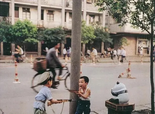 电线杆旁这俩小家伙拿着纸板和小木棍在玩打仗,笑得嘴都合不上,边上还有个煤气罐护栏做的小柱墩,以前的玩具不多,东西都是自己拼出来的,爸爸说他小时候也这么折腾,饿了回家啃馒头,喝口糖水,天黑了才肯收兵。