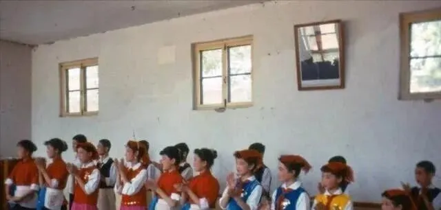 这张是学校文艺队排练,白墙上两扇小窗,女孩们穿着红黄蓝的演出服,拍着掌跟着节拍走,老师拿着口风琴在一旁点着头,那时候活动少,这样的排练能盼半个月,演完回家把红领巾解下来,心还在砰砰跳,睡觉都带着旋律。