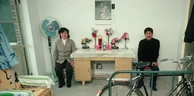 屋里摆着写字台、搪瓷台灯和一台吊扇,墙上挂着明星月历,门口横着一辆新擦的二八大杠,妥妥的三大件场面,新婚小两口坐在两边,笑里有点拘谨,妈妈看这张总爱说一句,那个年头结婚不讲排场,讲过日子,能买到这几样,心里就稳了。
