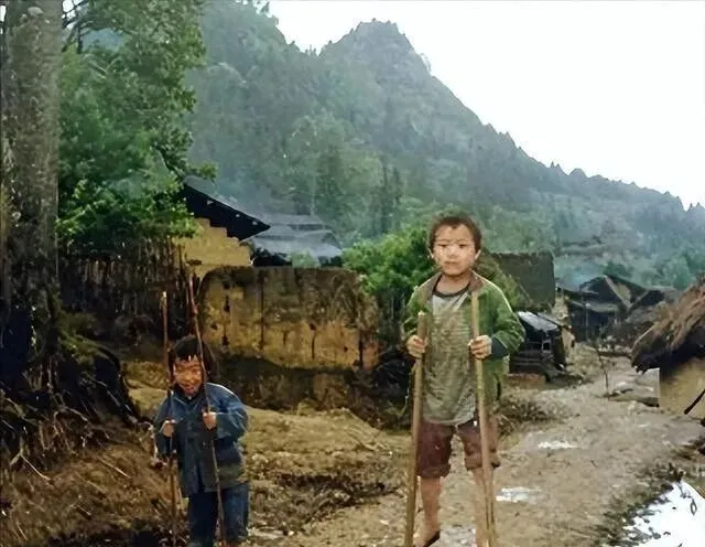 这两根竹竿是孩子脚下的高跷,泥路上坑洼一片,他踩得稳稳的,脸上有股自得劲,山那头云压得低,屋顶是土胚和茅草,小时候我也学着踩,摔进水洼里哭一鼻子,奶奶把我拎起来笑着说男子汉站起来再走一圈,以前玩耍靠想头,现在玩具多了,街上能听见的笑声却稀了点。