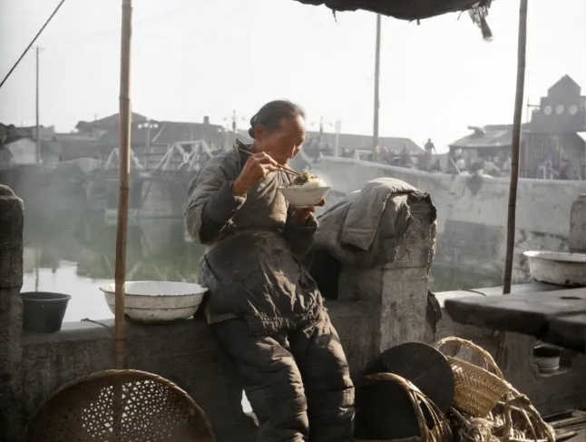 这张里头的场景叫码头口歇脚,石栏杆旧得发灰,竹篮靠在脚边,碗里是热气冲鼻的饭菜,大娘一手端碗一手夹菜,身上棉衣打了补丁,袖肘泛亮,背后雾气里人来人往,脚步匆,叫卖声该是有的,只是隔着水雾被压低了,奶奶说那会儿忙一天能坐下吃口热的就不容易,碗里多添两筷子菜心就知足了,以前填饱肚子是头等事,现在我们想着口味轻重热量搭配,日子拐了弯走到了另一头,码头还在变了样,人心里那点靠自己挣口饭吃的劲儿没丢。