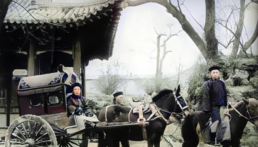 这个行头叫骡车,车厢窄小罩着花边的棚子,前头高轮子后头低轮子,木辐条一根根紧着缚,车舌连到套具上,骡子精神抖擞,耳朵立着,车旁跟着骑骡的随从,帽沿压低,衣摆收紧,门前的飞檐刻着纹样,影子落在青石地上,爷爷说,三品以上出门讲究车鞍红托泥,前有顶马开道,后有跟骡护着,路不宽也得让一让,车轮碾过去吱呀一声,人站在路边看热闹,心里也会嘀咕这趟去的是哪门子公事,以前官出行架势足,脚下多尘土,现在车多了路也阔了,倒没了那股子仪式感,讲究换成了效率,手机上一点导航就走。