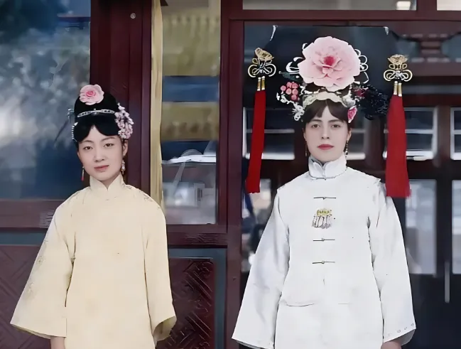 这画面里的打扮叫吉服样的女装头面,发间簪花大大一朵,边上坠着红缨垂穗,耳旁坠子轻轻摇,衣料选的是浅色细纹,另一位站在旁边,素雅的长衫利落地垂到脚背,门框后是深红的木格窗,光从侧面打过来,脸上干净清透,像刚抹过粉,老师说那会儿妆容简单,添个眉摸点粉就够,精气神摆出来就好看了,以前照片难得,人物一站就是正襟危坐的规矩样,现在镜头里更松弛,笑也随性,衣裳头面虽然不常见了,可讲究合体这四个字到哪儿都不过时。