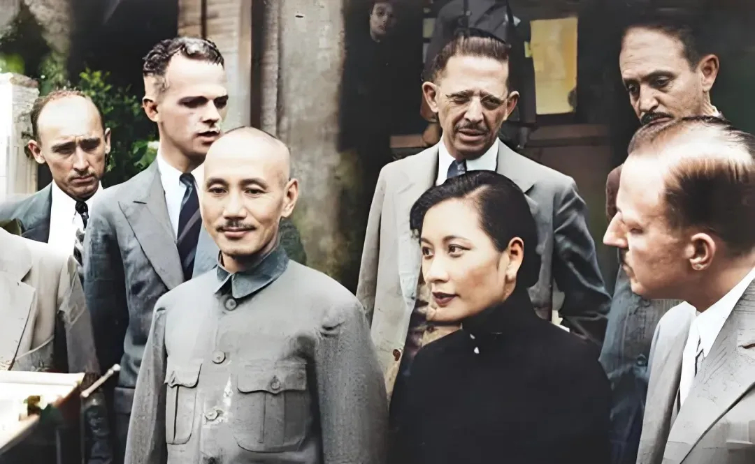 这张里,衣装的分野一目了然,中山装对着西装,领尖对着领带,颜色一深一浅,宋美龄在中间偏前,发髻利落,嘴角微收,周围的人站成半圈,像把一团热闹往中间端,镜头没有收得太紧,背景里能看见楼檐和石柱的角,石面被雨水刷过似的发暗,靠前的人衣服上有粉末印子,像是刚从地图沙盘旁边挪开,这点小脏不遮体面,反倒有了临场气,谈新闻的、做记录的、翻译的都凑上来,表情严谨,话说得不快,字字有落点。
