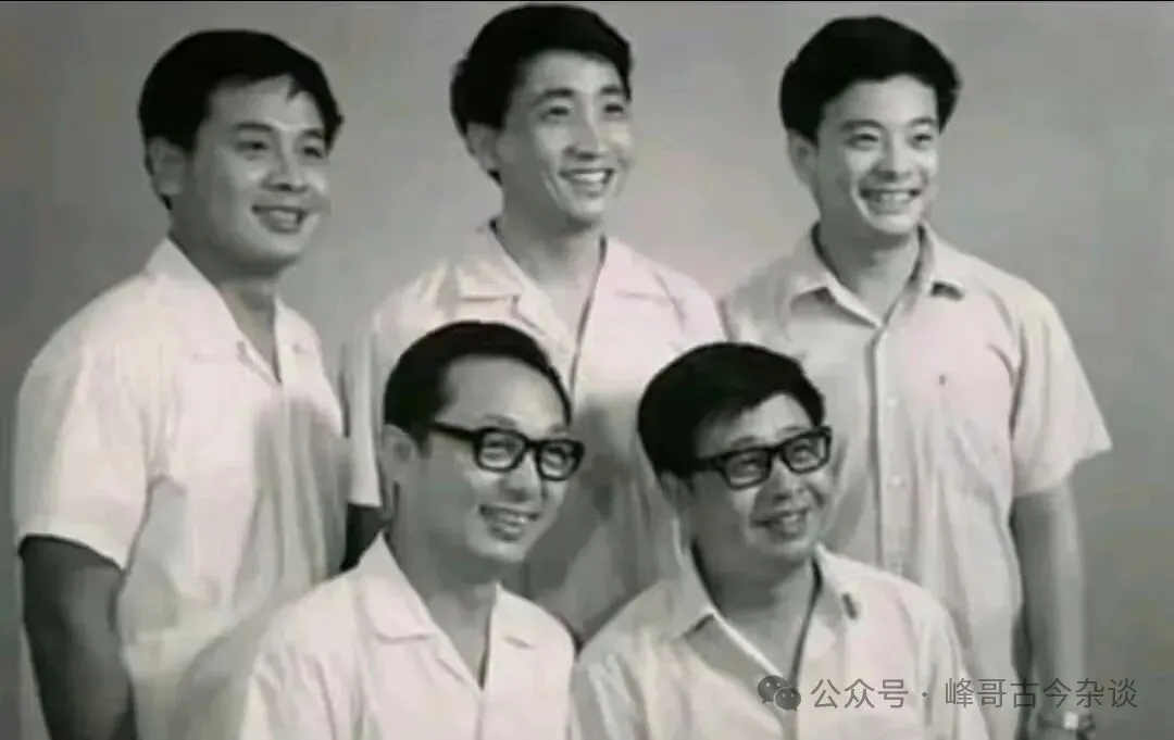 1979年,中央广播说唱团五位演员的合影。照片前排坐着的两位,左边是唐杰忠,年龄最大,47岁;右边是马季,45岁,马季戴眼镜的照片很少见;后排左一赵炎;中间是姜昆,两人都20多岁。