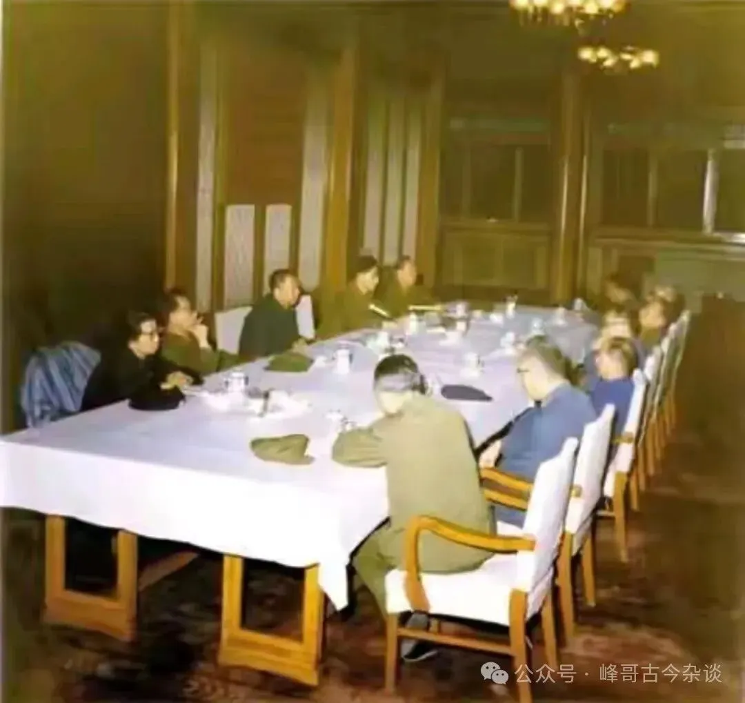 1976年10月4日,中南海紫光阁一张罕见的留影。借着微弱的灯光,华国锋主持了这一次特殊的会议。镜头中,张春桥在左排左二的位置,王洪文在左排左四的位置,二位都身穿军装,还有一位穿军装的坐在王洪文身边,左排右一是汪东兴。这次会议姚文元请假没有来,以“遗孀自居”的江青,坐在左一的位置。谁都想不到,这张照片拍过两天后,里面的三个人成为了阶下囚。