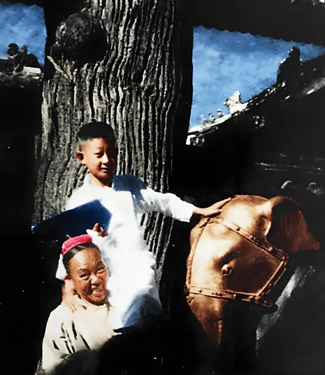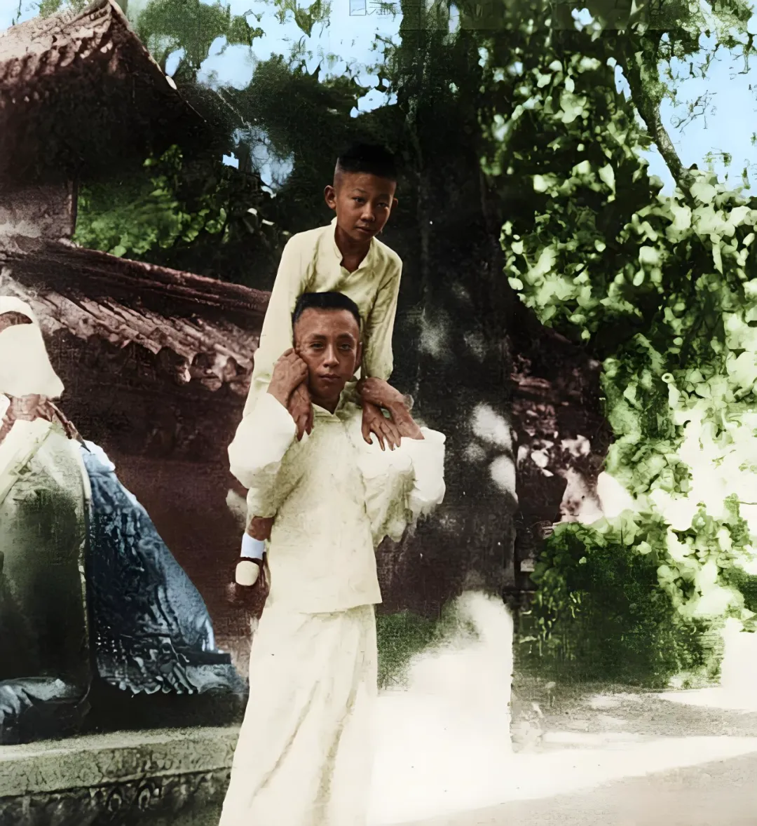 清末,紫禁城内,溥仪身着白色传统服饰,戴着眼镜,将润麒扛在肩头;润麒穿着浅色衣装,姿态自在。彼时在紫禁城内,溥仪虽已无实际皇权,却仍在皇室语境中维持着帝王的“架子”,却甘愿让这位小舅子骑在自己脖颈,足见润麒格外受宠