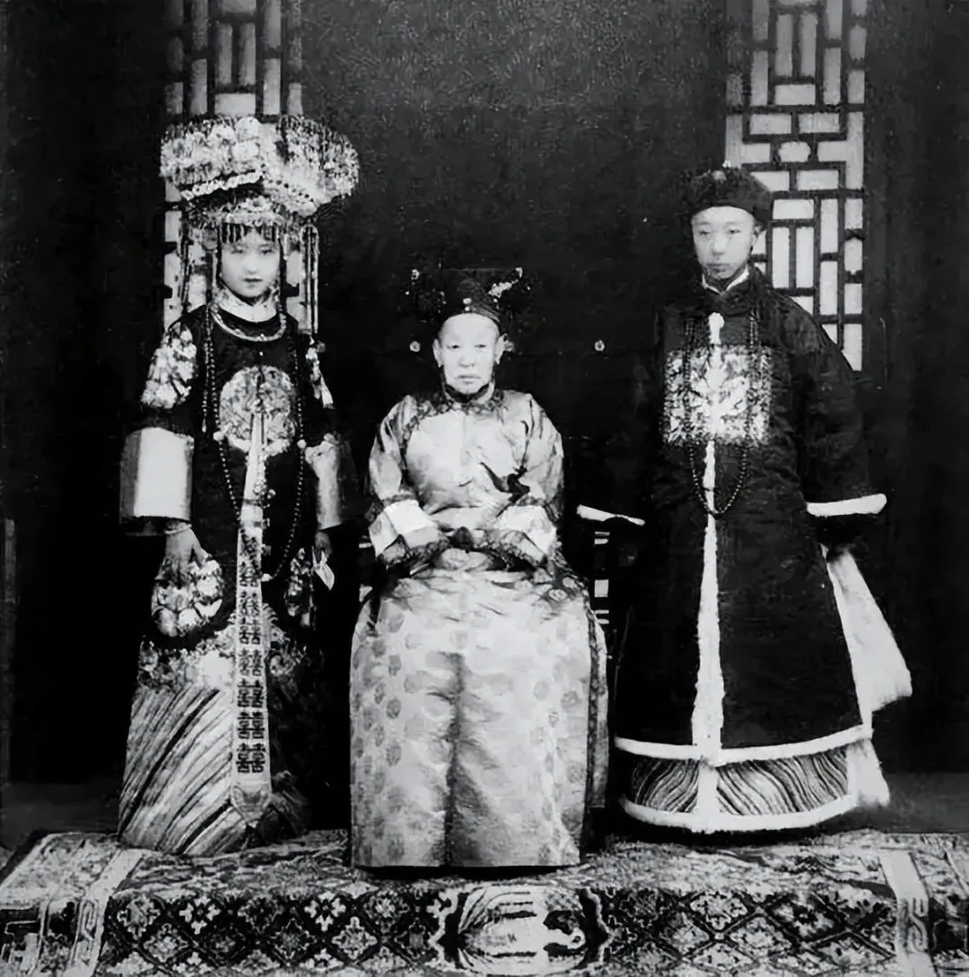 这张照片是溥杰与唐怡莹的结婚合影,中间的老太太是溥杰的祖母刘佳氏(醇贤亲王奕譞的侧福晋,溥仪和溥杰的亲祖母)。