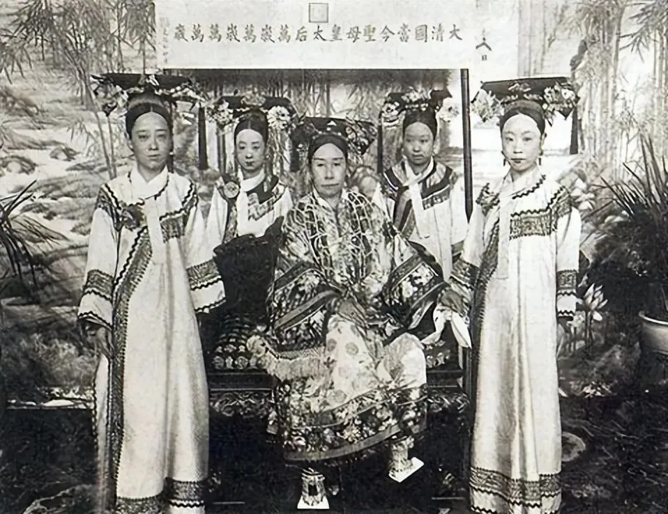 这张晚清宫廷合影以慈禧太后为核心,照片左起依次为御前女官(作家)裕德龄、庆亲王奕劻之女四格格、慈禧、慈禧内侄媳元大奶奶、中国近现代舞蹈先驱裕容龄(德龄之妹)。