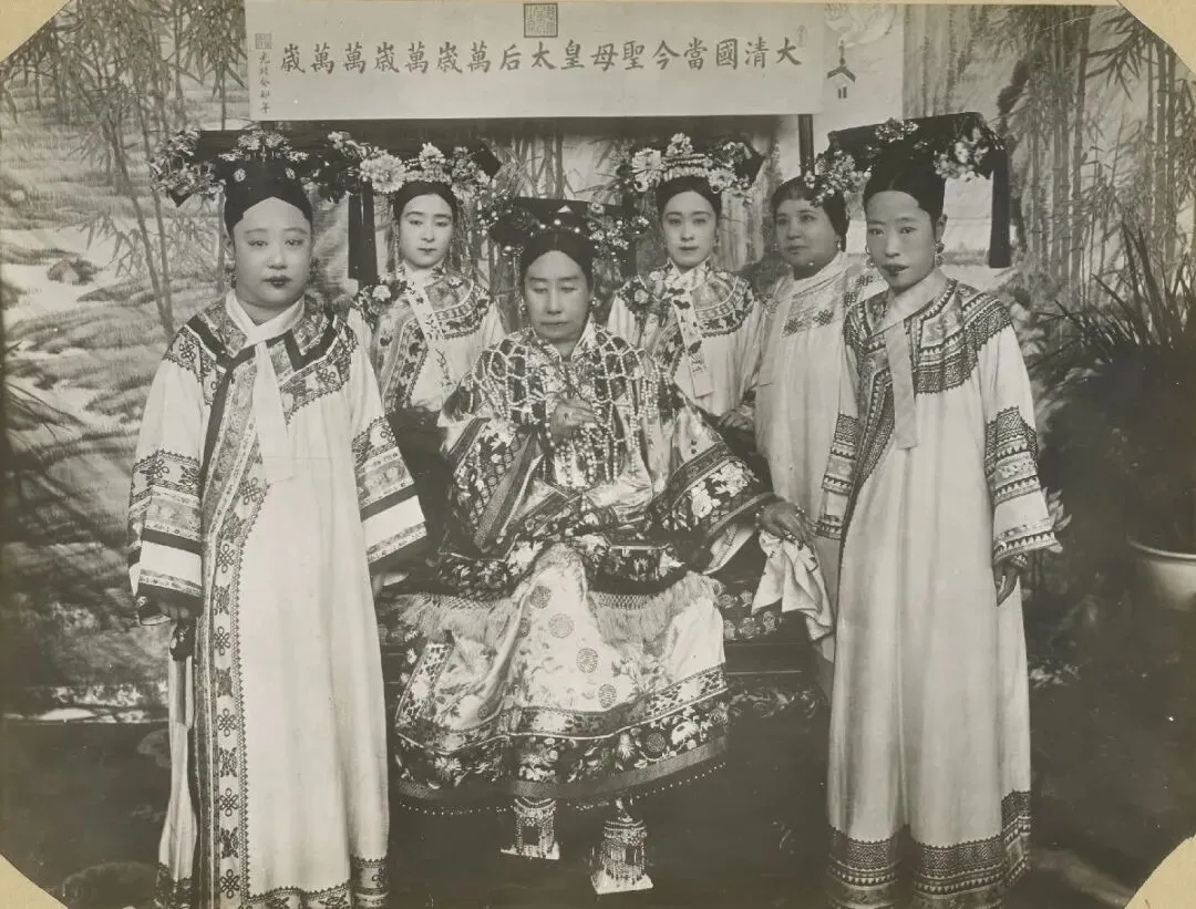 这张晚清宫廷合影以慈禧太后为核心,她身着华贵宫廷服饰端坐中央。左起依次为光绪帝妃嫔瑾妃、御前女官(作家)裕德龄、慈禧、中国近现代舞蹈先驱裕容龄(德龄之妹)、容龄之母路易莎·皮尔森、光绪帝皇后(晚清最后一位太后)隆裕皇后。