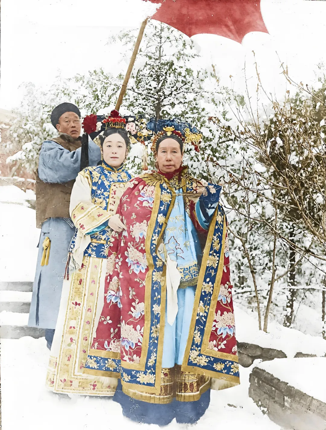 这张拍摄于晚清颐和园雪景中的照片,慈禧太后身着绣满精美花卉的华贵服饰,头戴精致头饰,尽显皇权威仪。身旁搀扶她的是御前女官裕德龄,这位精通多国语言的女官曾为慈禧担任翻译,其著作《清宫二年记》等详细记录了清宫细节。后方为其撑伞的是太监崔玉贵,他是慈禧身边的核心太监,在清宫中颇具影响力。