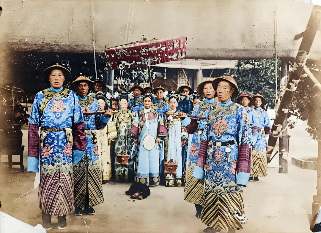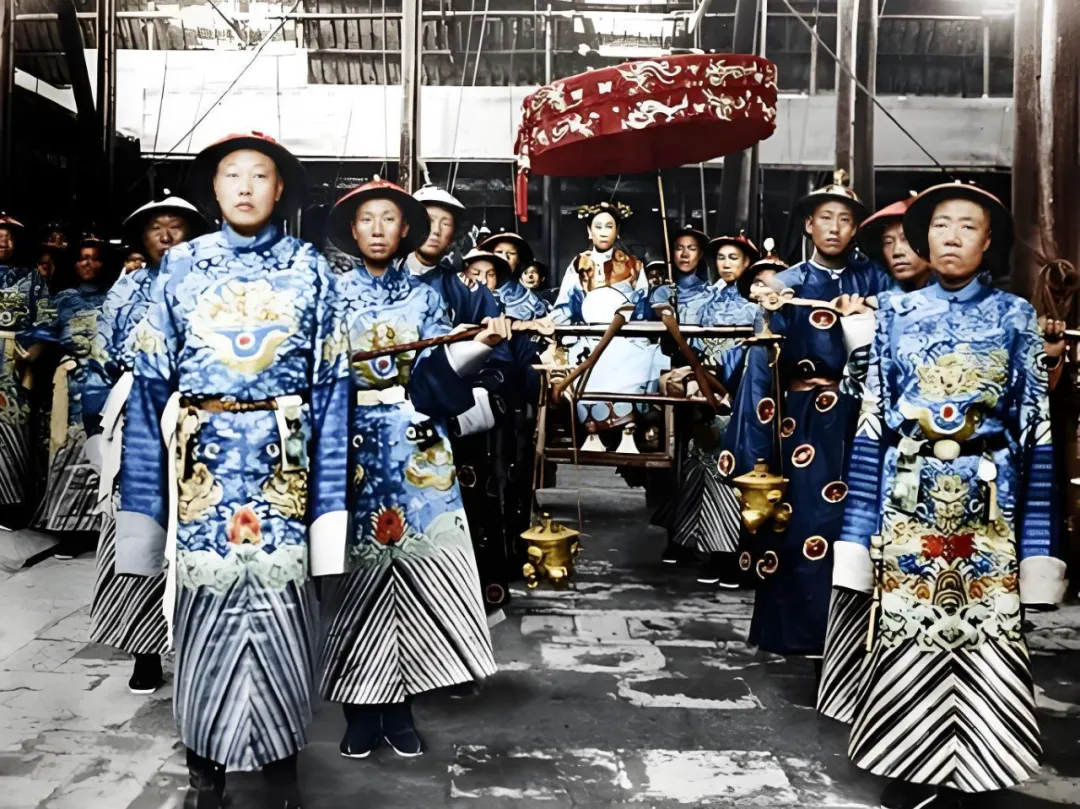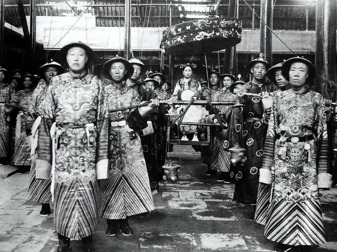 前排领头开路的左侧是二太监崔玉贵,神态肃穆,深得慈禧信任,曾参与“珍妃投井”事件,是晚清宫廷权力斗争的关键人物之一,其行事风格较为凶悍,在宫中颇具威慑力;右侧则是权倾一时的大太监李莲英,慈禧太后最信任的大太监,陪伴慈禧近五十载,官至二品顶戴,是晚清太监集团的核心人物。他擅长揣摩人心,凭借对慈禧的绝对忠诚,在朝中势力庞大,甚至能影响朝政决策。两人作为慈禧身边的核心太监,在晚清宫廷中地位显赫。
