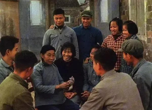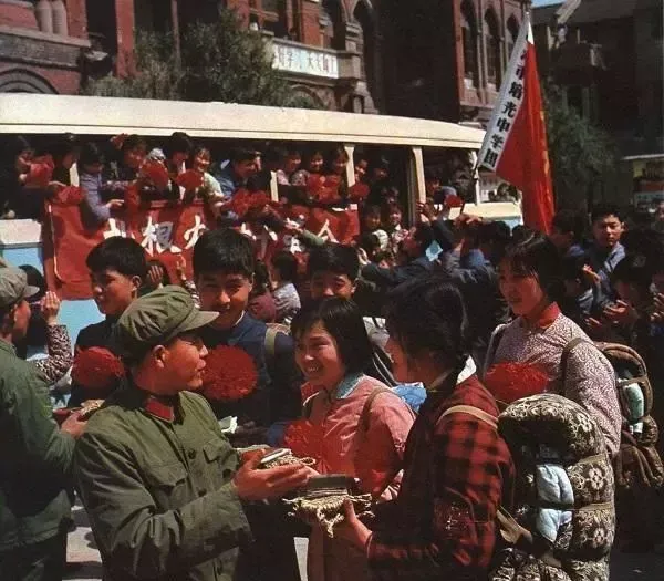 某部队指战员们把自己做的针线包和草鞋赠给即将奔赴农村插队落户的知识青年,鼓励他们扎根农村。