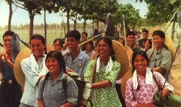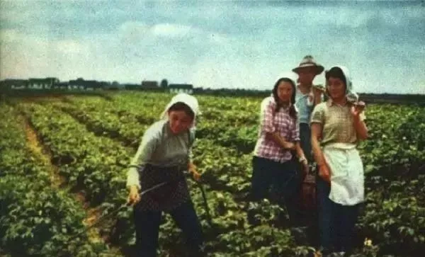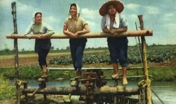 最早搬上银幕的知青故事《我是个新社员》。上海天马电影制片厂下放到农村劳动锻炼的演员们在车水。左起:上官云珠、王丹凤、张乾。
