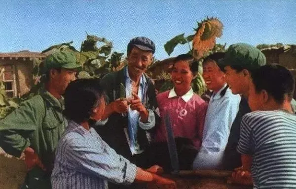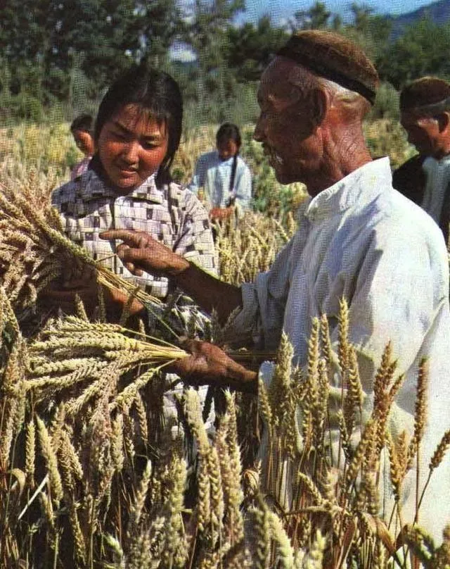 在新疆新源县红星公社插队的汉族知识青年向当地维吾尔族老农探讨农业知识。