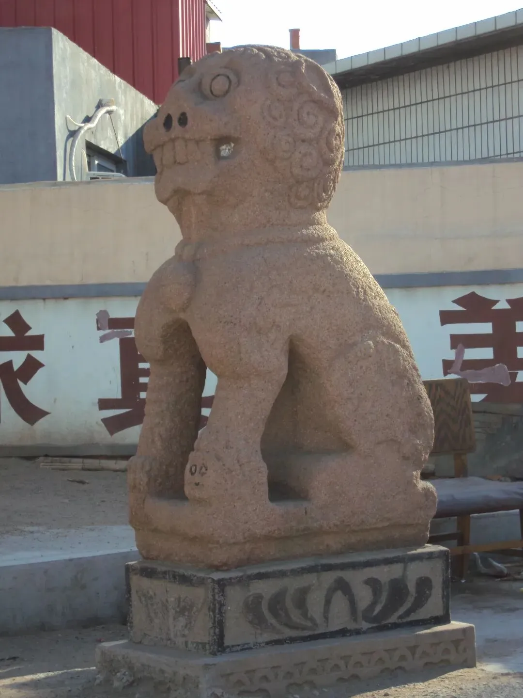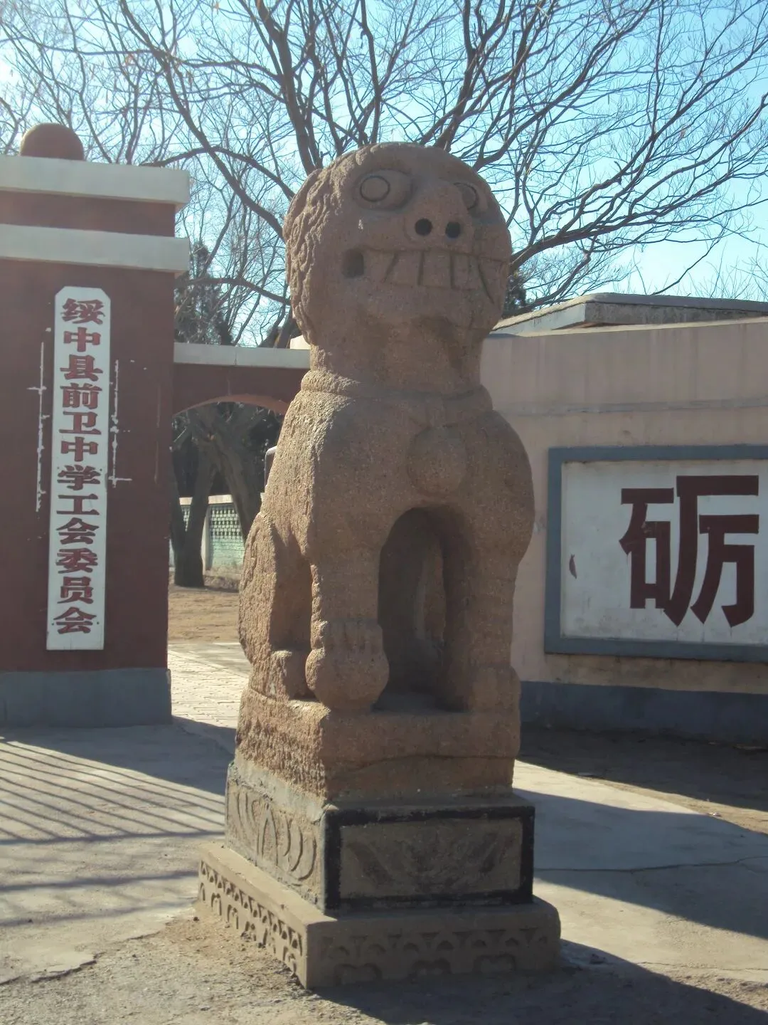 最惹眼的,是校门外两侧摆着的一对清代石狮子。那狮子个头不小,往那儿一蹲,整个校门都显得沉稳庄重了许多。凑近了细看,又觉得这狮子其实挺喜庆——大大的眼睛瞪得圆圆的,嘴巴张得老大,露出一排整齐的板牙,看着既威风,又透着一股活泼劲儿,一点儿也不吓人。