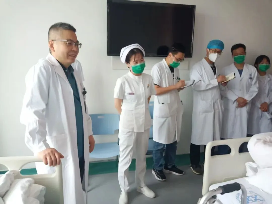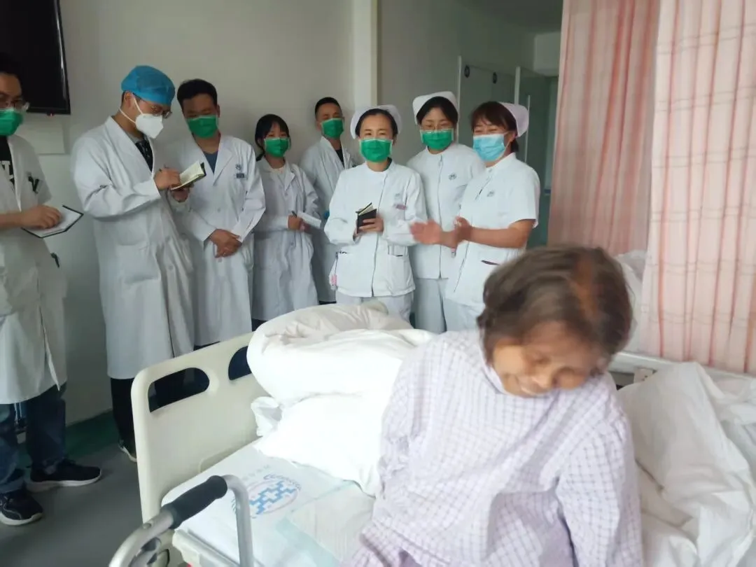 5月31日下午,祝永刚医生带着护士长和医生们来查房。他站在母亲床边,笑着说:“老太太,给我们唱首歌吧。”