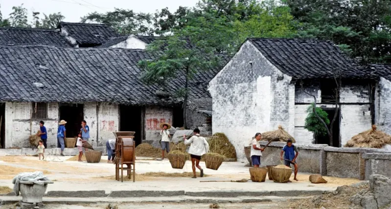 这张里热闹,场上铺满了谷子,木连枷横着拍,谷粒像雨点一样跳,男人抡臂,女人端着竹篮来回接应,机器一旁哒哒响,孩子在边角踩着影子走格子,日头一偏,金光往上一抹,人影全被拉长了,收尾时大家身上都是米香味,回家一脚踏进门槛,锅里马上就添上一勺新米。