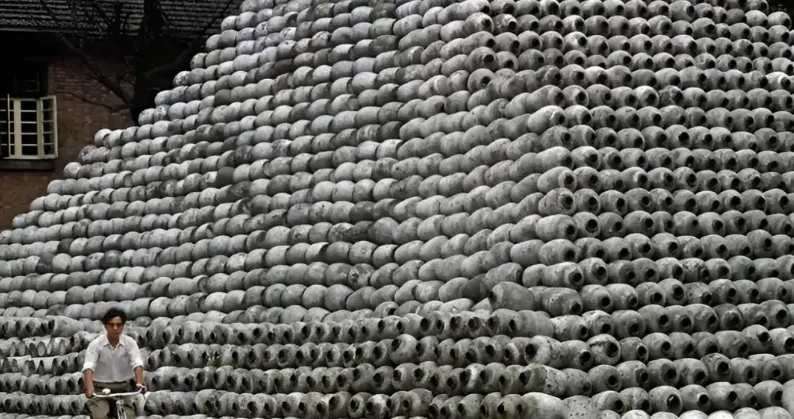 这堆灰黑色大肚皮的是黄酒坛,一只一只叠起来像小山,坛口朝外,黑边子全是窖泥烘出来的颜色,站在下面抬头看有点晕,仓库口常年潮乎乎的味道往外冒,掌柜的拍着坛身听回音,闷闷的说明封得紧,谁家办席面就来挑两坛,写上粉笔字抬走,到了冬天暖一盅下肚,浑身都活络了。