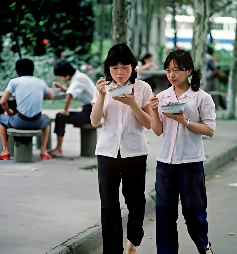 这个场景不复杂,搪瓷大碗,竹筷子敲在碗沿叮地一声,两个小姑娘边走边吃,袖口上还留着水迹,八十年代的衣裳素净,工厂里下班拿票子领餐是常事,咬一口面,辣油顺着碗壁往下挂,小步往前挪,后边石凳上一堆男孩子嘻嘻笑,风一吹,树叶和汤气都往人脸上扑。