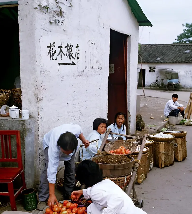 这堵白墙上写着花木旅店四个字,指头一戳方向箭头就知道拐哪儿,墙根下地摊一溜摆开,番茄堆成小山,鸡蛋在箩里挨着,挑担的木扁担搁在桶沿喘口气,摊主抬眼看天色,算算还能卖多久,小时候跟着奶奶买菜,最爱蹲在篮子边挑歪把子的小葱,奶奶笑话我挑剔,回家还不是一锅下。