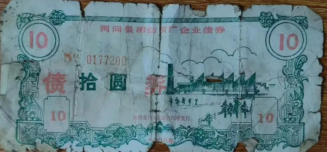 原来,这张老照片距今已经过去将近40年了!那个时代,省、沧、河三级领导兴奋地在即将建成的棉纺厂前合影;39年后,曾经承载太多人青春记忆的河间棉纺厂,又已经消失在历史中,这其中的巨大变迁,又怎能不让人感慨万分呢?更让人感慨的是,前不久,一位朋友发来一张“河间县棉纺织厂企业债券”的照片,面额为10元,四方被花纹包围,最下方写有“一九八八年”字样,看来,1987年棉纺厂开始建设,1988年向全县发行企业债券,工厂开始全速前进,到上世纪90年代,正赶上“非农业户口”时兴的年代,大批心怀梦想的少男少女来到河间棉纺厂……再到本世纪初的国企改革后又离开,只剩下一张张老照片背后的回忆在微风里吹拂。你看上图这张企业债券下方,还有“河间县各专业银行代理发行”的字样,那时候是叫“专业银行”的,“商业银行”的称呼,是1996年之后的事了!40年光阴流转,照片里意气风发的建设者、债券上泛黄的印记、车间里穿梭的青春,都已沉淀为时代的注脚。唯有那些别在口袋里的钢笔、被风吹起的白色风衣,还在记忆深处轻轻晃动,那是回不去的黄金时代,却也是永远鲜活的青春底片。