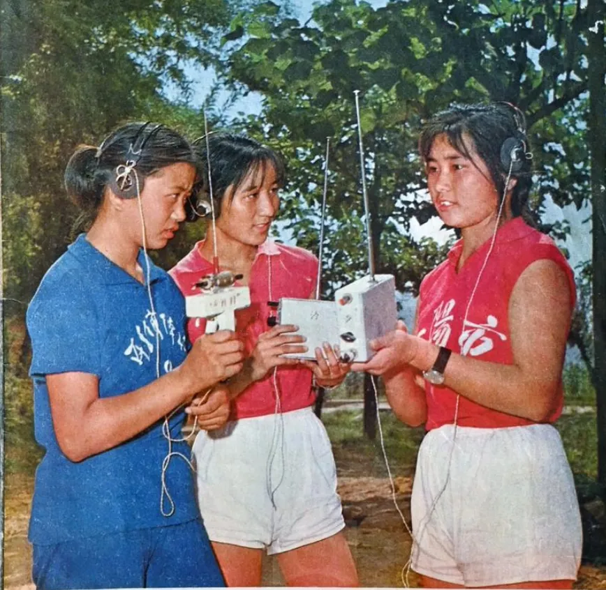 我还在照片里发现了一个很有意思的东西,有几个年轻人戴着耳麦,手里拿着一个类似随身听的机器。