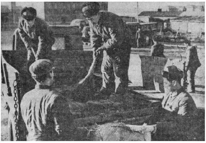 雷锋始终保持艰苦奋斗的政治本色,处处珍惜国家财产。这是他和战友们一起把撒在汽车上的水泥收集起来。