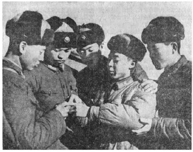 雷锋对人民对同志象春天般的温暖。这是他在帮助战友缝被子。