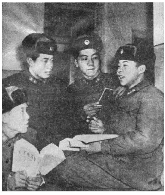 雷锋和战友们一起交谈学习毛主席著作的心得体会。