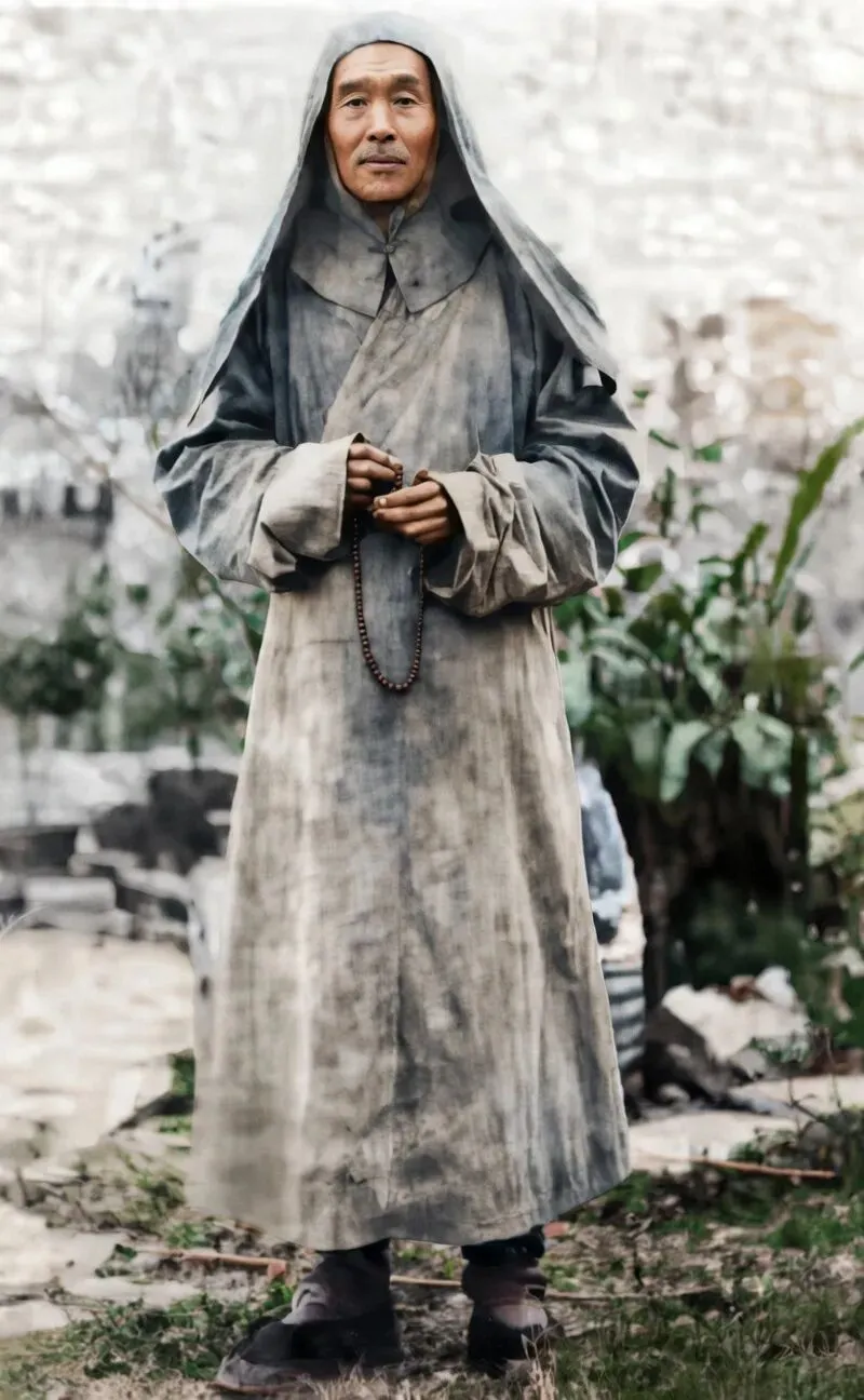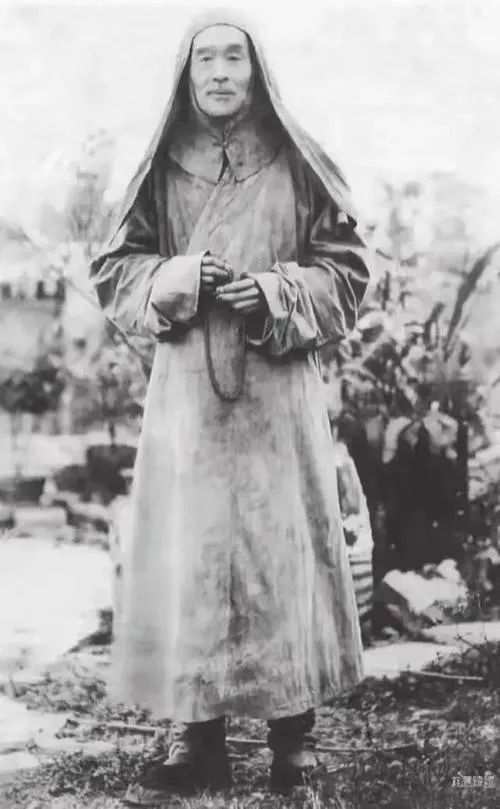 1941年泉州,这帧现存最晚年的弘一法师影像,摄于泉州开元寺。时值小寒节气,七十三岁的李叔同裹着百衲风帽,袈裟褶皱里凝结着晨霜的晶痕。