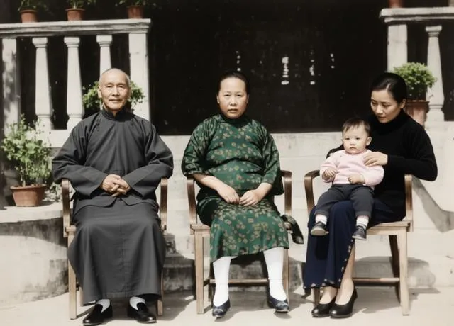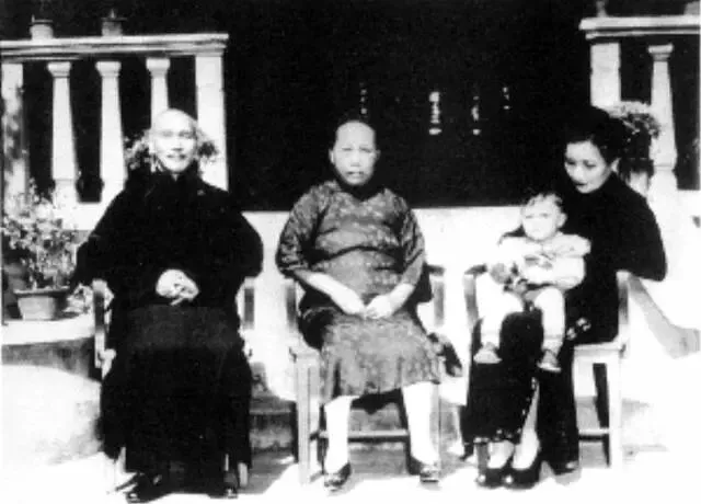 蒋介石身着长衫,双手交叠于腹前;毛福梅端坐在太师椅中央,宋美龄侧身立于左侧,她怀抱的蒋孝文,这个被刻意安排的站位暗藏玄机:毛福梅虽已离婚,却仍占据宗法意义上的"正妻"位置;宋美龄虽贵为第一夫人,此刻却像个闯入传统家庭的外来者。
