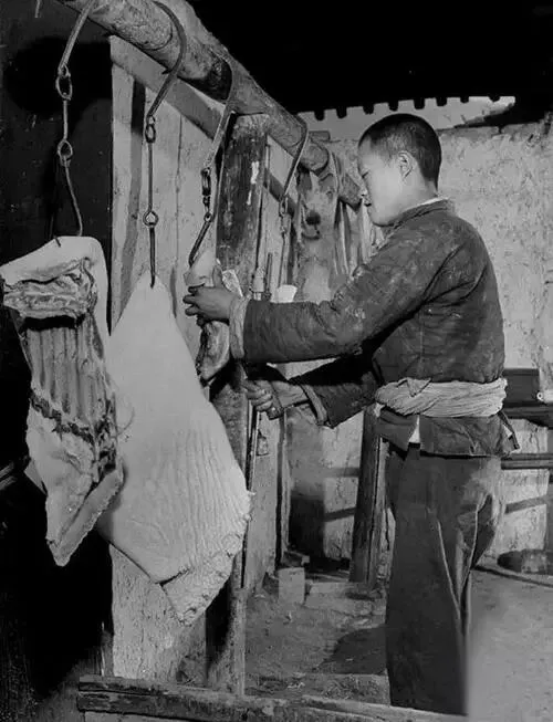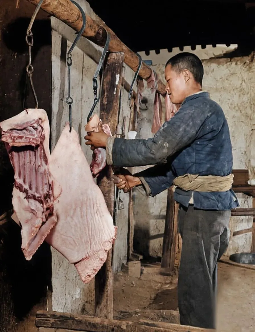1947年,陕西临潼的一隅乡村,岁月的笔触绘出一幅质朴又鲜活的市井图。日光带着清晨特有的柔和,轻轻洒落那里,一根粗壮的木架突兀而立,上头挂着刚刚屠宰好的新鲜猪肉。
