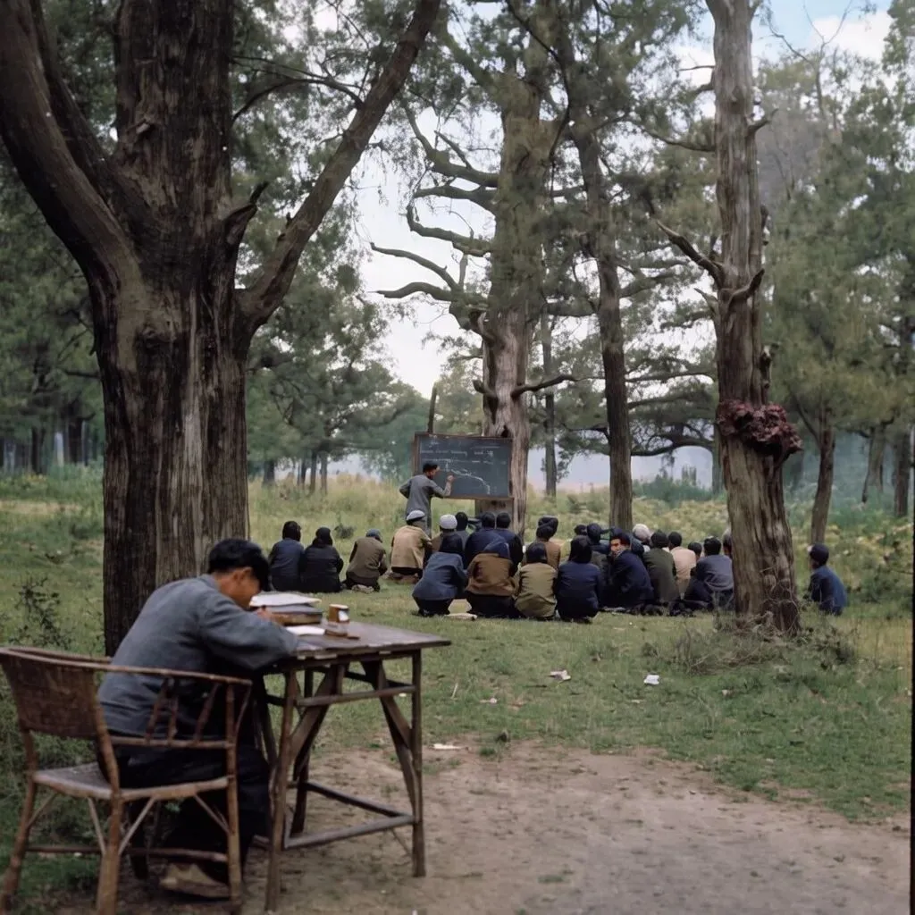 繁枝蔽日,落叶覆径,他们因陋就简支起桌椅,以莽莽林海为天然课堂,于簌簌松涛间重续求知之弦——纵使战火迫近,那朗朗书声,仍倔强地在枝叶缝隙间流淌,似暗夜星火,坚守着知识传承的微光。