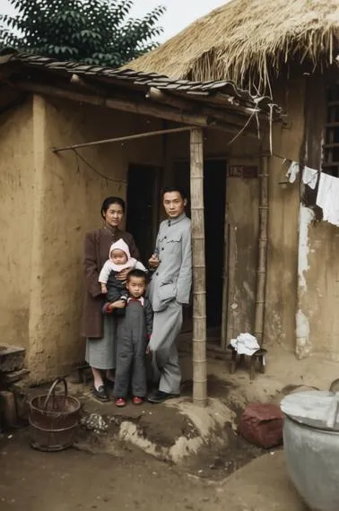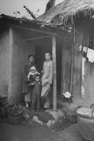 1945年12月,重庆。历经大轰炸洗礼的山城,仍留着战争的斑驳痕迹。一户中产阶级家庭立于临时住所前,谷草房顶在寒风中摇曳,无声诉说着战时躲避炮火的艰辛。