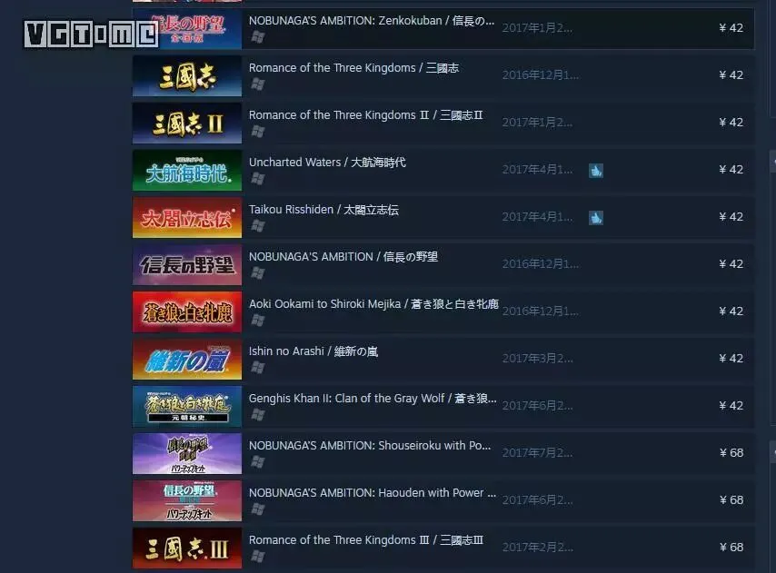 先前光荣旗下的《三国志》系列、《信长之野望》系列、《苍狼与白鹿》等等都已登陆Steam平台,完整列表可以☞ 点击这里