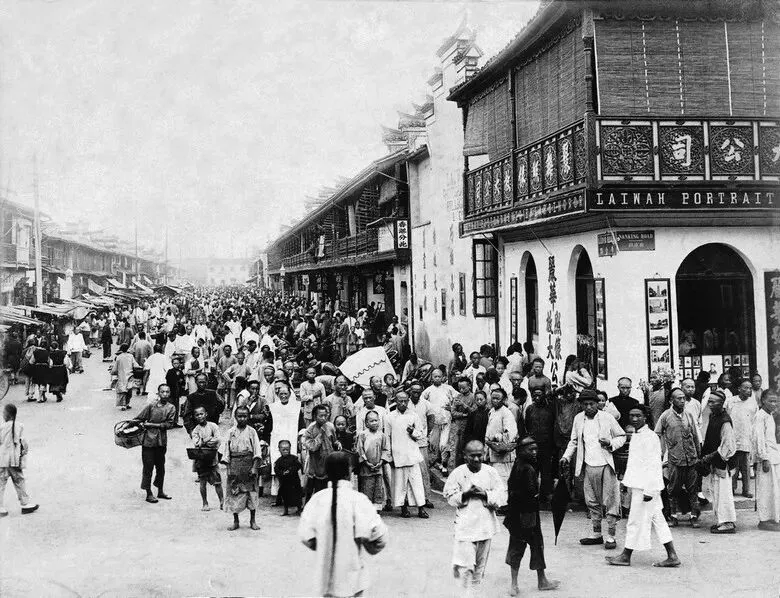 晚清时代,刚刚开埠不久的上海南京路,前景是一所照相馆,远近的人都在恬然地面对着眼前的摄影机。(原载《老照片》第32辑)