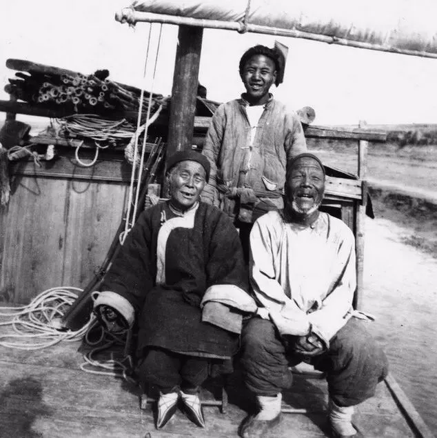 小清河上的船夫一家,船主已七十三岁,身体健康、精力充沛,比他小六岁的妻子只掌舵不做饭,一家人“幽默乐观永不知疲倦”。摄于1903年。(原载《老照片》第87辑)