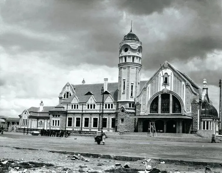 1911年,济南火车站前道路尚在铺设,钟楼上尚未安装大钟。(原载《老照片》第88辑)