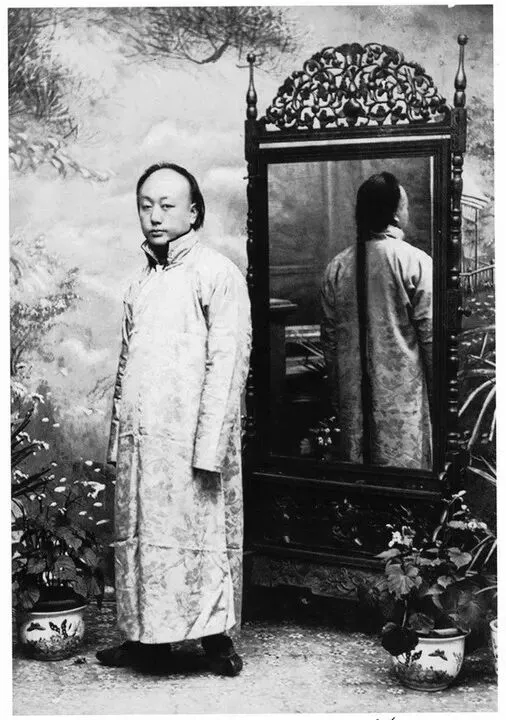 1912年,一位年轻人剪辫之前在照相馆的留影,与陪伴了自己二十几年的长辫作最后的告别。(原载《老照片》第12辑)
