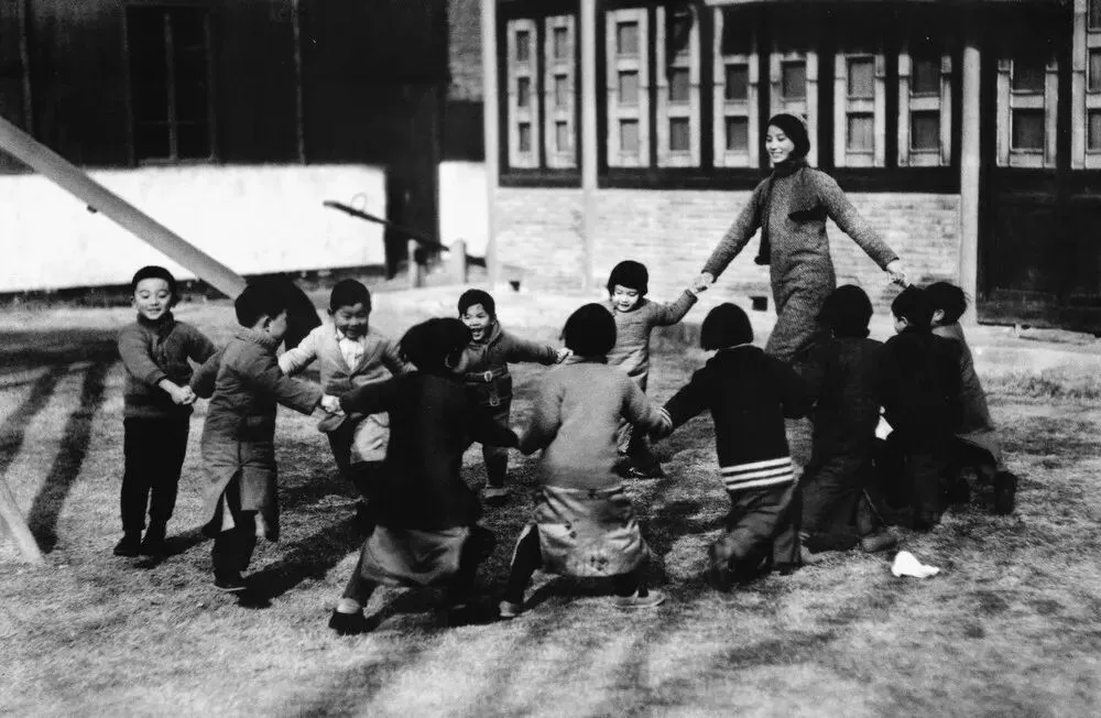 1935年12月30日,南京金陵女子文理学院的一位年轻的幼教老师带着孩子们在草坪上做游戏。(原载《老照片》第6辑)