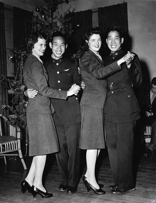 1945年圣诞夜,中国空军某部人员与驻广州的美军联欢。(原载《老照片》第26辑)