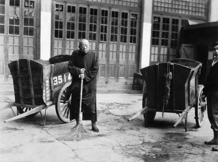 1951年,八十三岁的黄金荣在上海大世界门口打扫卫生,接受劳动改造。两年以后,黄金荣在上海病逝。(原载《老照片》第38辑)